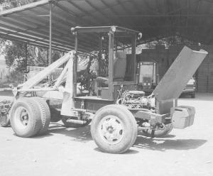 Weyand added a floorboard, seat and steering wheel on a pedestal to make an open operator's station just behind the forks, in front of the rear-mounted engine. He designed a hydraulic steering system for the loader.