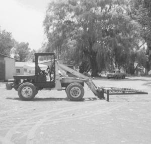 Over the drive axle, he mounted a GB Hi-Lift loader that he bought used. Then he built heavy-duty forks for the loader.