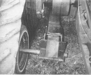 The idler wheels on his prototype are made from regular car tires - one 24 in. and one 18 in. diameter. The drive wheel is a 24 1/2-in. truck tire measuring 42 in. in diameter. The track is made from a 42-in. tractor tire.