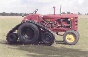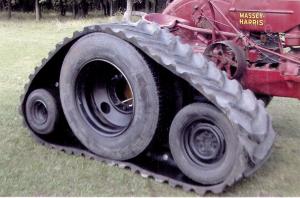Toew's prototype uses tractor tires to form an endless track. His system works on 2-WD or 4-WD tractors and requires dual wheel mounts because the center lugs operate between the duals.