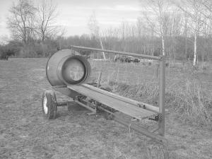 A pto-driven chain that turns on a sprocket at the front of the machine pulls each tree through the cone. As the tree leaves the cone it drops onto a wooden platform that extends the length of the machine.