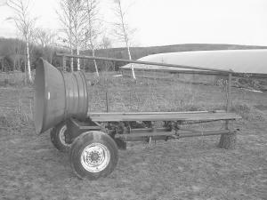 He stripped a New Holland 1-row corn chopper down to the frame, wheels, axle and gearbox and narrowed up the axle. He used a cutting torch to shorten the axle. He welded a Ford tractor wheel on back of the frame, then cut a metal cone off an old 3-pt. fertilizer spreader and bolted it to the back of the wheel. A stabilizer bar runs from the top of the cone to the front of the machine.