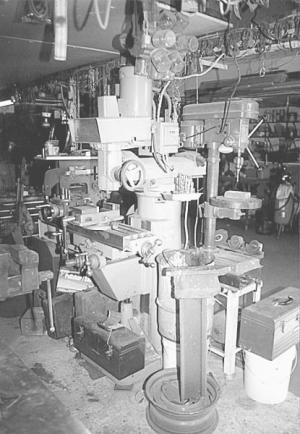 Pat Prom, Eden Prairie, Minn.: "I came up with my own space-saving work island by butting several big shop tools together back to back. The tools include a milling machine, iron worker, shear, and drill press. By placing the tools back to back I can get all of them into a smaller area without taking up as much wall space. I keep a portable anvil nearby that I made out of an old wheel rim and a length of railroad track.