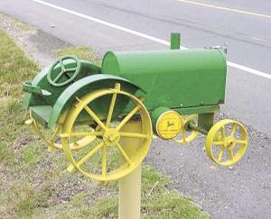 Even though I was raised on Farmalls, I also acquired a fondness for green and yellow tractors which explains the mailbox's coloring.