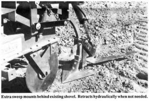 Schaffert furnishes a mounting bracket and clamps. You furnish the cylinder and make up your own blade by welding a long (from 20 to 8 in.) extension onto a cultivator sweep. Works on conventional or ridge till row crop cultivators, and isn't bothered by heavy trash, says Schaffert.
