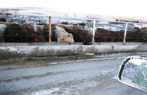 To make it easy to clean old feed out of the bunks, Faubion welded a round steel disc to a 6 1/2-ft. long piece of steel pipe. A length of chain bolts to the end of the pipe. To clean out the bunk, he hooks the chain onto the bucket on his front-end loader and then drives alongside the bunks.