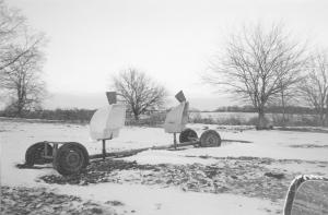 He bought the running gear at a sale for $35 and turned it upside down so the feeders would be low enough for cattle to eat out of them. He removed the original 18-ft. long coupling pole and welded on a length of 4 by 4 steel tubing between the front and rear axles. The metal stand on each feeder was rusted out so he replaced it with a welded-on length of steel pipe. The pipe fits into a hole that he cut into the steel tubing.