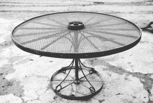 One of the main transport wheels is used for the table top, with the spokes supporting a flat piece of expanded metal mesh. The hub at center can be fitted with an umbrella or even a rotating lazy susan table.
