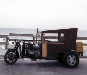 Here's a picture of a "three-wheeler" I built in my farm shop. It has a Perkins 104 diesel motor, an 8N Ford tractor radiator, a Deere turbo charger, a Datsun rear end and transmission, plus miscellaneous airplane parts, Volkswagen parts, and more. We've taken long trips from the Smokey Mountains to Florida and it rides great. A fun ride. (Kazira Temple, 5435 Co. Rd. 78, Pisgah, Ala. 35765)