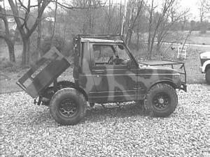 He gave the vehicle a camouflage paint job and also replaced the Samurai's original tires with 15-in., 12-ply lugged tires off a forklift.