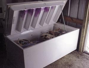 Freezer To Store Cattle and Deer Feed LIVESTOCK Feeding Equipment 27-1-42 I had an old upright freezer that didn't work any more. Instead of throwing it away, I decided to lay it flat on a couple of treated 4 by 4 wooden posts inside our barn. My wife uses the freezer to store cattle and deer feed. The seal around the door keeps out rodents and insects. (Terry and Debbie Benoit, 1077 Bobcat Road, Orange, Texas 77632)