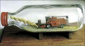 Instead of ships, Paterson made 35 different combines of various makes and models, putting them together inside clear glass olive oil bottles. They caught on fast and Paterson filled orders from people as far away as Ontario and Illinois, at a price of $150 each.