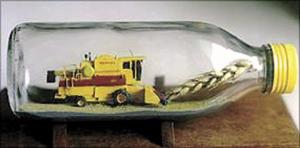 He obtained tiny decals to identify the makes and models of combines and in the nose of some bottles, he included a head of wheat positioned as though it was about to enter the combine pick-up.