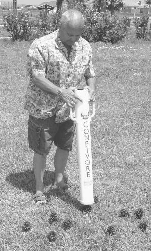 You simply push this 3-ft. long poly pipe down on top of a pine cone and the slotted nylon cap sucks them up. It'll pick up cones between 2 and 7 in. in dia. "My husband is 6 ft. 6 and I'm 5 ft. 4. We figured we needed something that we could both use comfortably," Seefeldt says.