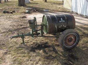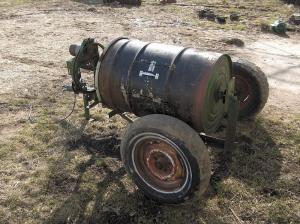 The 55-gal. composter rides on the running gear from an old cattle loading chute. Using a jig saw, he cut a 12-in. wide door into the side of the drum.