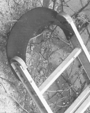 It consists of a twisted tire sidewall, bolted securely with washers to the top end of the ladder.
