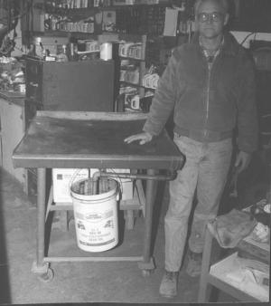 Bob Bugger, Effingham, Ill.: "My home-built, portable metal table provides a good place to work on oily parts, without making a big mess. It has a concave top that slopes to one end of the table, where a built-in trough directs oil to a small hole at one corner of the table. From there, the oil drains through a metal pipe and into a bucket below the table.