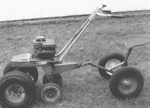 "My grandkids love driving it," says Wochinski. "At full speed it goes at a fast walk. The drawbar hitch pin forms an articulation point, so I can turn around on a dime. Whenever I turn, I put a little down pressure on the handlebars which causes the small wheels to lift up slightly," he notes.