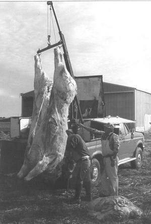 Gerry doesn't have a livestock trailer to bring animals to town so he decided to call on a local on-farm butchering service. He also feels that calm animals make the best beef so by butchering on the farm, animals don't have to go through the trauma of transport.