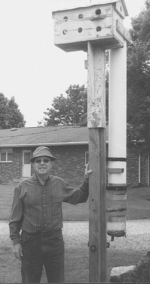 The fake wooden bird house is located about 200 ft. from his martin houses, and is mounted on a pole about 10 ft. above the ground. There's only one hole leading into the bird house, and it has a small aluminum "teeter totter" mounted just inside it. A length of 8-in. dia. pvc pipe attaches to a hole at the bottom of the house. When the bird lands on the teeter totter, it drops to the bottom of the bird house and into the pipe, sliding down to a wire mesh cage at the bottom of the pipe. It has a hinged door on it for removal of birds.