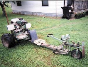 He cut the 4-speed tractor in two and welded an angle iron frame between the sections, dropping the seat to about 4 in. from the ground. He welded stirrups for his feet behind the front wheel axle.