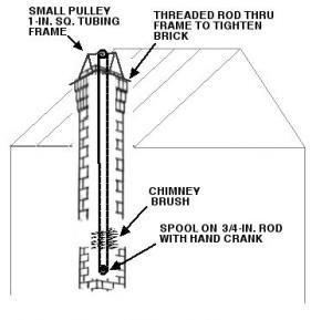 "I didn't want to risk climbing a ladder to clean the 30-ft. high chimney on our house so I built a chimney sweep that lets me clean the chimney by simply turning a crank at ground level. I installed a square metal frame over the top of the chimney with a small pulley fastened to it. A stainless steel cable runs from a spool attached to the crank and is attached to a 10-in. wide brush that has a 15-lb. weight attached to it. The crank extends through a small hole that I cut into the bottom of the chimney. When I turn the crank one way it winds the brush all the way to the top. Then I turn the crank the other way to let the brush back down. It takes 16 turns of the crank to completely clean out the chimney.