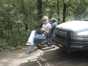 The Army works with the state's Natural Resources Department every spring to survey the roadsides for turtle nests. It's a lot easier to do this with a vehicle-mounted chair than leaning out of a window for hours. We also use radio locators to find all kinds of animals from turtles and hawks to bears and wolves, scanning for signals from specific tagged animals. It's much easier to do this from the chair than holding the antenna out a window. It can be an exciting ride. The rider always wears a seat belt. I got the idea from the John Wayne movie "Hatari". (Keith Ferdon, 13134 57th Ave., Motley, Minn. 56466 ph 218 746-4485; keith.ferdon@us.army.mil)