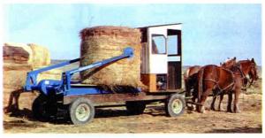 "It works as well as any tractor or 1 pickup-mounted bale handler," says Gunter. "We use it to feed about 10 bales every day to our 300 cows. The telescoping arms let us load or unload both bales without having to move the horses. The bale handler weighs 950 lbs. and is balanced by the weight of the cab in front. When we unload a bale off the back of the wagon, the front wheels jiggle a little but the front end doesn't raise up. The arms can lift 2,700 lbs.