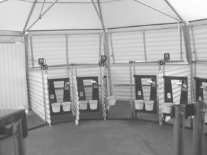 As the center core is lifted up, the legs swing into place. Bolts lock each leg joint. Pegs are driven in the ground, one to either side of each leg, to lock it in place. Removable panels attach to the legs on the outside and on the inside to form the pens. Side panels that can be raised or lowered as needed are added. Customers can choose from hard plastic panels or heavy plastic mesh.