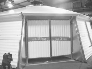 A translucent fabric roof is attached over the top along with an adjustable cover to the chimney/core. At that point the approximately one-ton structure can be lifted into place by a boom on a tractor loader.