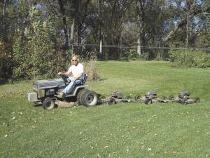 "Each of the trailing mowers has a 5 hp motor, two of which I replaced in the past couple years, so there's plenty of power to mow my regular lawn and the ditches on my quarter mile driveway. Now I can mow more ground in an hour than I could with the rider alone in three hours," notes Loken.