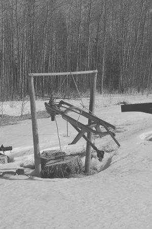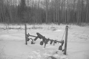 Botsford found that, by putting posts in the ground, nailing a 2 by 4 across the top, and hanging the implement a couple of inches off the ground with ropes, hooking up and unhooking goes a lot quicker.
