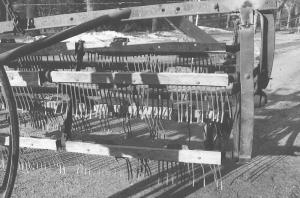 He then mounted half a dozen metal rake heads to each bar by placing them between two 1 by 2-in. wood strips which he bolted to the bar. To power the rake, he modified the ground drive to run off an old 3 hp gas engine.