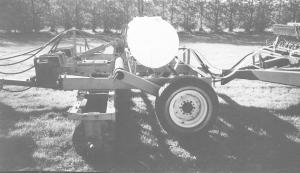 The caddy has a self-leveling tongue on back that always keeps the back of the caddy even with the tongue on the drill. It consists of a 3-in. sq. metal tube inside a 4-in. sq. tube. As the machine is hydraulically raised for road transport, the rocker shaft shoves the 3-in. tube down through the 4-in. tube which shoves the tongue down to keep the drill level with the caddy. "If I want I can use a turnbuckle on back of the caddy to adjust the height of the self-leveling tongue," says Field.