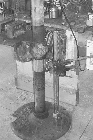 Richard Heimberger, Lucas, Ohio: "I have an old drill press equipped with a table that can be adjusted up or down. The only way to move the unit was by hand, which was difficult to do because the table is heavy and the vise that's attached to it is even heavier. To make it easier to raise and lower I adapted an old lever-type jack. I made a metal sleeve to go around the post that's loose enough to slide and then attached the jack to it. Now I can just jack the table to whatever height I want, yet the table is still free to swing in any desired location because it rides loose on top of the sleeve."