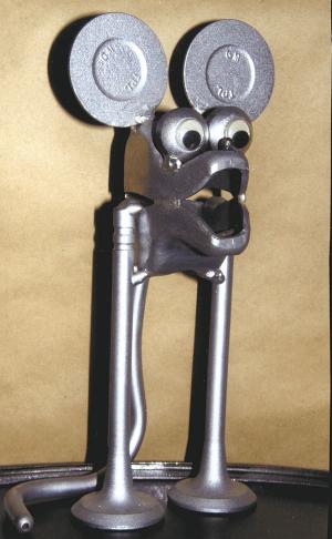 I made this 10-in. high ornamental mouse by welding together parts off a 350 cu. in. engine. The legs are made from intake valves, the ears from exhaust valves, the head from a pair of rockers, the tail from a push rod, and the eyes from rocker balls. The eyes have floating pieces of round black plastic in them which are free to move around.