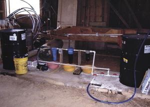 The system consists of a 300-gal. bulk tank and two 55-gal. barrels spaced about 15 ft. apart. A 12-volt pump with a filter and valve system are positioned between them. There are three filters in line. The last filter is fitted with a magnet specially designed for engine oil. It picks up particles down to 1 1/2 microns in size. Waste oil is delivered to Rosenboom's farm and stored in the 300-gal. tank, where any water and solid particles settle to the bottom.