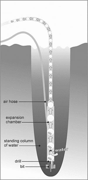 A small hole is dug and water is added. Then the pipe with the sander and bit inside is inserted into the hole. As air passes up the pipe, it creates a vacuum that pulls in the water and soil to the surface through a hose. After filtering out the solids, the water is returned to the hole.