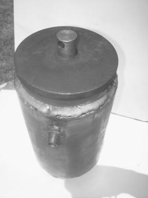The filter housing measures 6 in. in dia. and 12 in. high and bolts to the veggie oil tank. It consists of a Baldwin semi truck fuel filter inside a 5-in. dia. metal container that's inside a 6-in. dia. metal container, forming a water jacket. There are four ports, for fuel in and fuel out and water in and water out. You splice into the vehicle's fuel tank line and also into the heater hoses. A T-handle with bolt is used to open the lid for changing the filter. "It works fast because the entire container gets heated. As soon as the temperature gauge reads normal operating temperature you're ready to switch over to veggie oil, without having to wait for the oil to warm up in order for it to flow. After driving five miles or so you're ready to change from diesel fuel over to veggie oil. And it'll handle up to 10 gallons per hour so it has a lot of capacity."