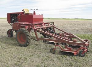 One thing he wouldn't change is the simplicity of the rig, including how the two 60-in., 3-pt. hitch mounted finish mowers are mounted. If he wants to use one on a tractor, all he does is reverse the gearbox, pull a couple of pins and it's ready to go. The 10-ft. cut overlaps the wheel width on the swather, so he can trim within 4 in. of a building. He especially likes the hydrostatic drive on the old swather and what that lets him do.