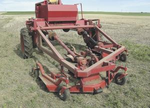 Ivers started with a 400 Versatile swather he picked up for about $800. The new deck mowers cost him about $1,500 each. Other parts and steel ran another $700. Modifications to the swather were limited to removing the cab and header table and moving the rear wheel.