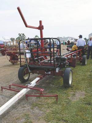 Moving big round bales is fast and easy with this self-powered bale carrier that's designed for use with horses but could also be used behind pickups or tractors without hydraulics. It was demonstrated at Horse Progress Days in early July. The 19-ft. long unit can handle up to four 4 by 5-ft. bales per load, loading and unloading quickly.