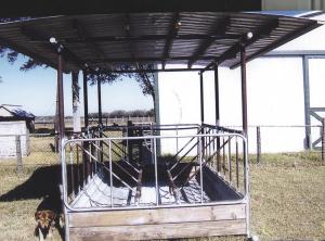 I made this covered hay feeder to save hay and keep bales dry. It measures 11 by 6 1/2 ft. with a 15 by 15-ft. roof over the top and a metal floor. The main frame is made of 2 3/8-in. drill pipe while the dividers are 1-in. sucker rods. Gates at each end swing open to load bales. The 2 by 8 boards lift out on each end to clean out. (Benjamin Stolarski, Sealy, Texas ph 979 885-6786)