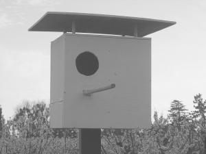 The wooden boxes are designed to mount on a pole or tree 12 to 14 ft. above the ground. Cedar wood shavings should be placed in the bottom of the box for use as nesting material. A small door on one side can be opened to clean out the box once a year. Gibson recommends one nesting box for every 10 to 15 acres.