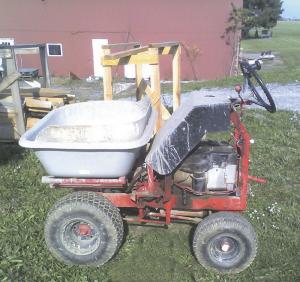 "I own a business installing residential fencing and mix batches of sack crete to set the fence posts. I dump material from the concrete mixer drum into the my homemade buggy. It saves a lot of time," says Bontrager.