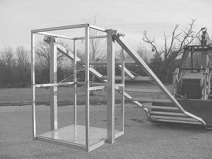 The cherry picker frame slips over a pair of metal forks welded to the bucket and is held in place by a cable and chain. "It takes only five minutes to hook the frame and chain up to the bucket," says Eilers.