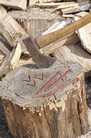 "I screw three 6 to 7-in. screws into the top of my wood-splitting block, about 2 in. apart in a triangle," Hendershot says. "Leave about 1 1/2 in. sticking out, and grind the heads of the screws into points."