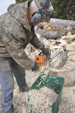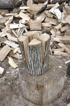 "You just have to be careful you don't cut too far and hit the spikes," Hendershot says. "When you've cut all you want, just turn the block upright and split the rest of it."