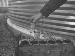 The first engine I tried it on was a well-rusted block from a Ford 6000 tractor. This block was stripped except for the one piston and rod that a mechanic friend had been unable to drive out with a hammer six years ago. It had lain on its side outside since the last attempt.