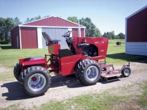 The tractor's frame was fashioned from parts off an IH 37 disk, while the transmission, axles, and 6.50 by 16 wheels are out of a pair of 1960s Chevrolet 3/4-ton pickups. A 4-cyl. water-cooled gas engine from an Owatonna self-propelled windrower supplies the power. The tractor articulates via a single 2 1/2-in. hydraulic cylinder that acts on a 1-in. dia. shaft. A double hydraulic pump that came off a combine provides power steering.